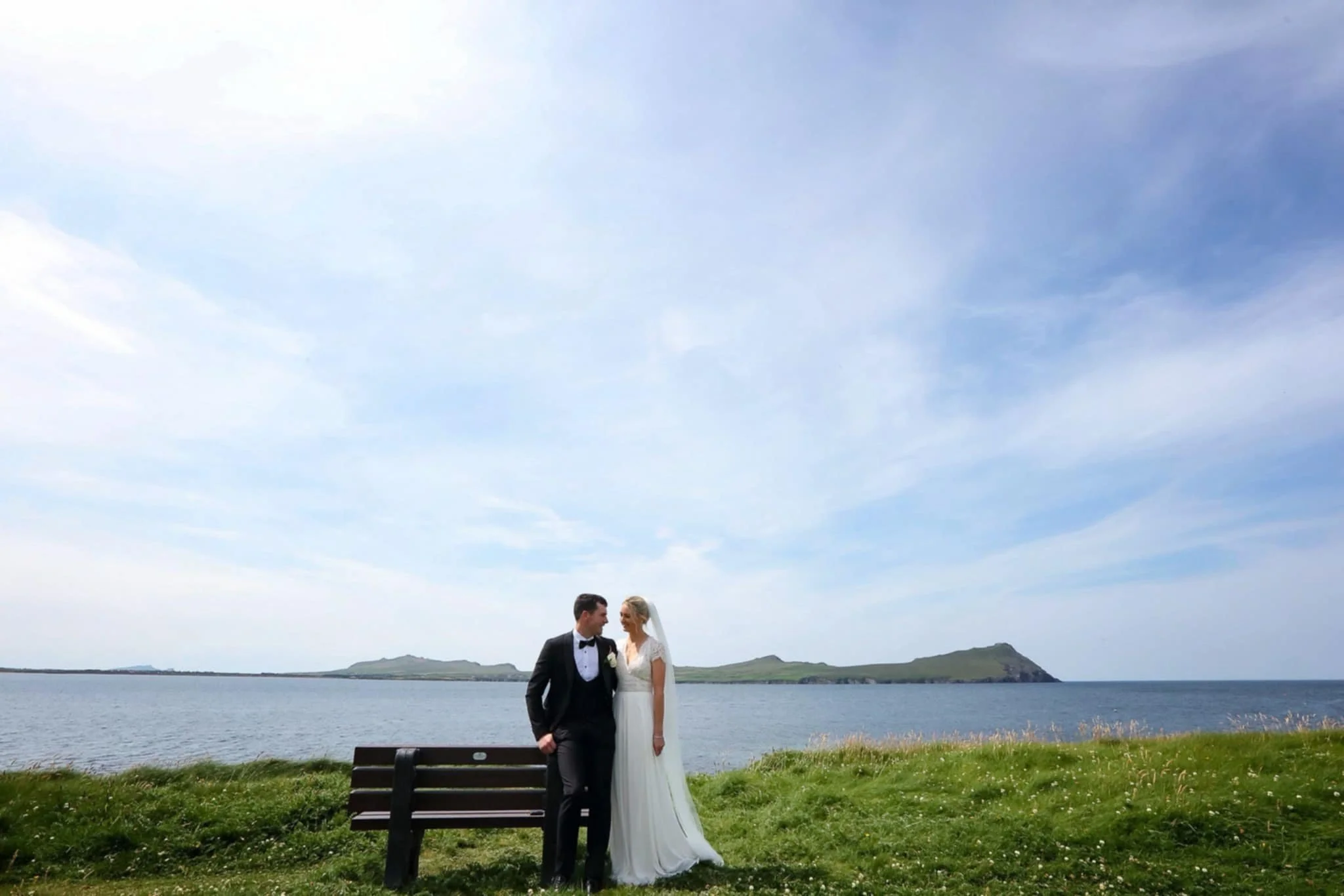 Bride and groom in wedding attire standing close together by a bench near a body of water, with green grass and islands in the background under a partly cloudy sky.