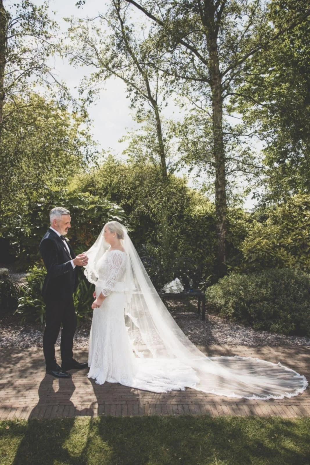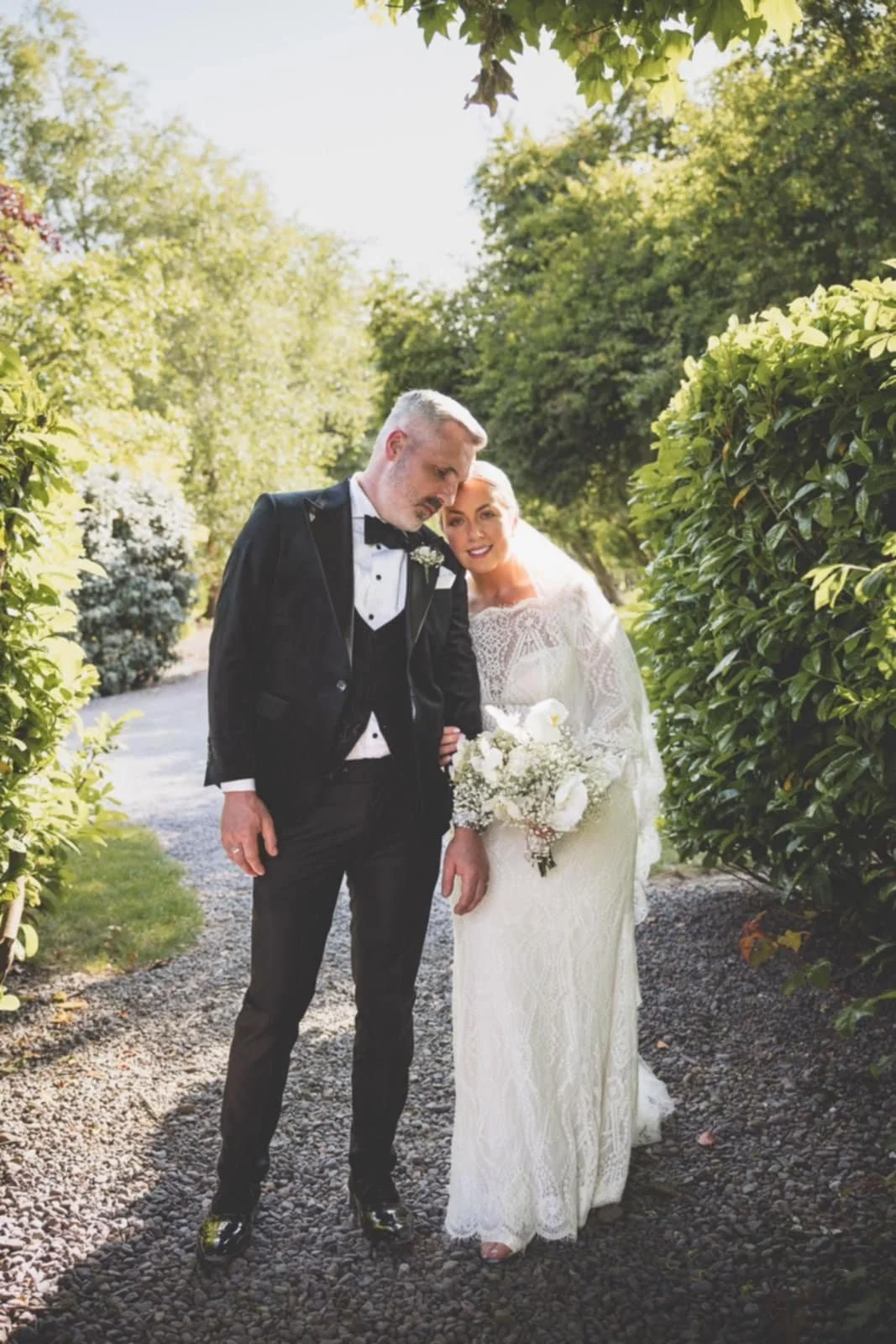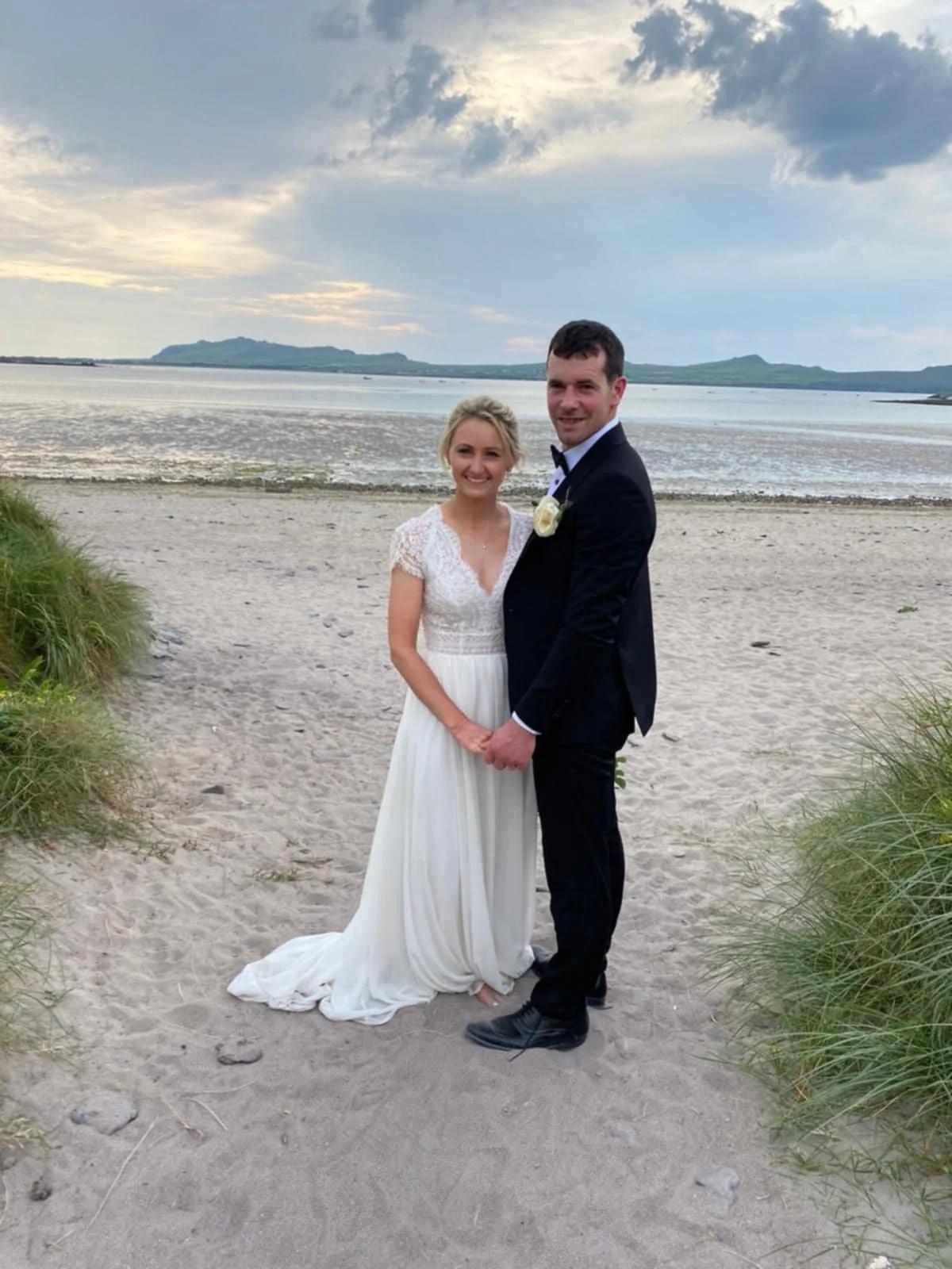 A bride and groom standing outdoors on a sunny day. Brides hair styled by Dingle-based hairstylist Maire Johnson View fullsize