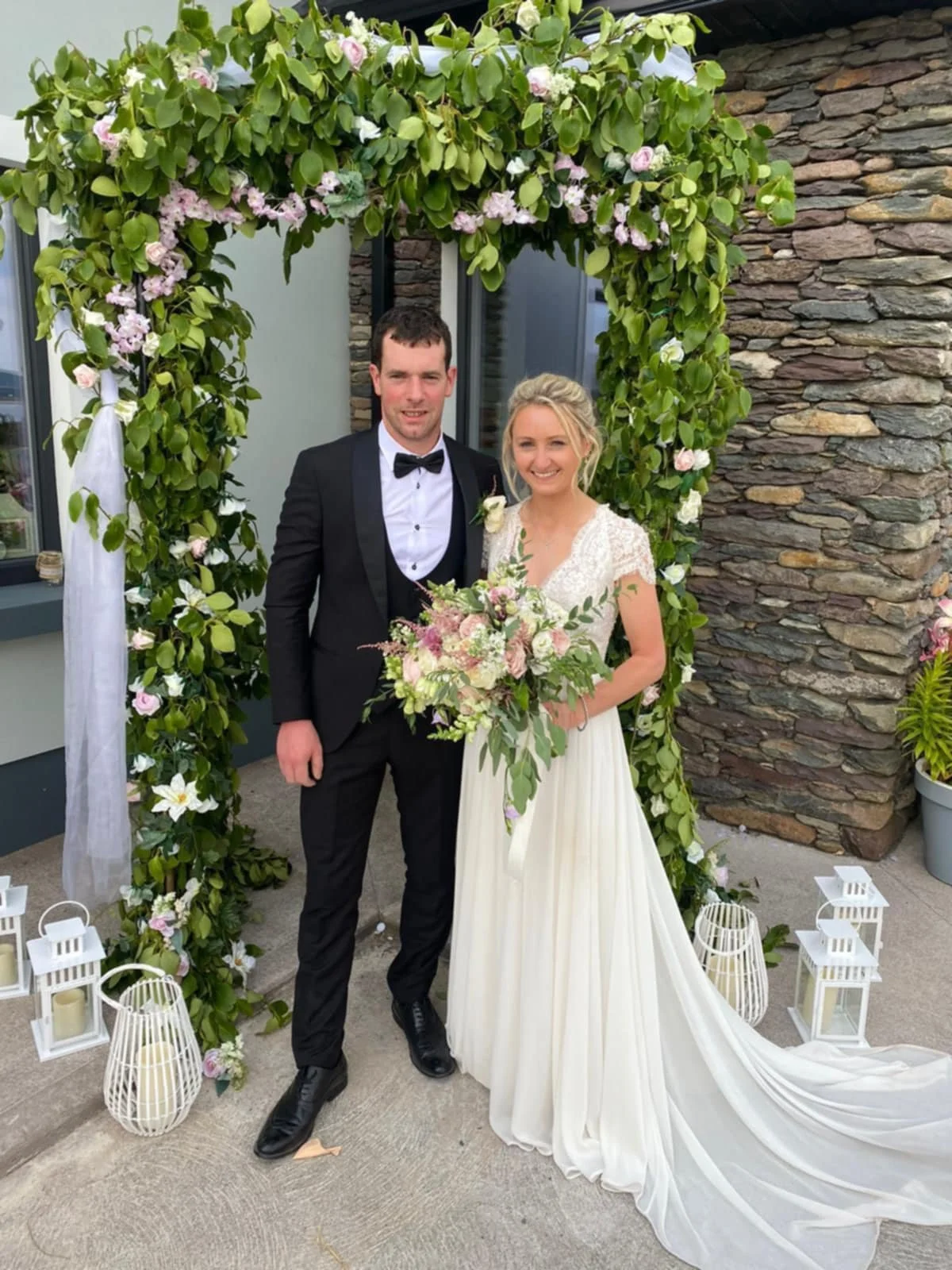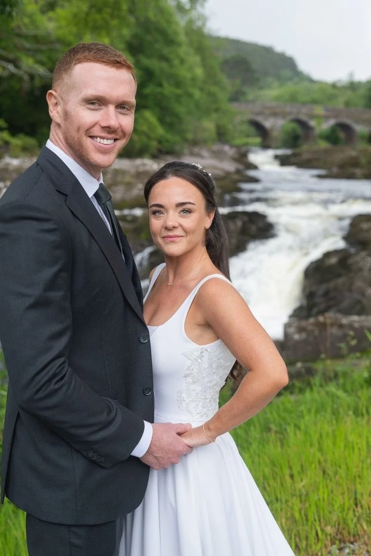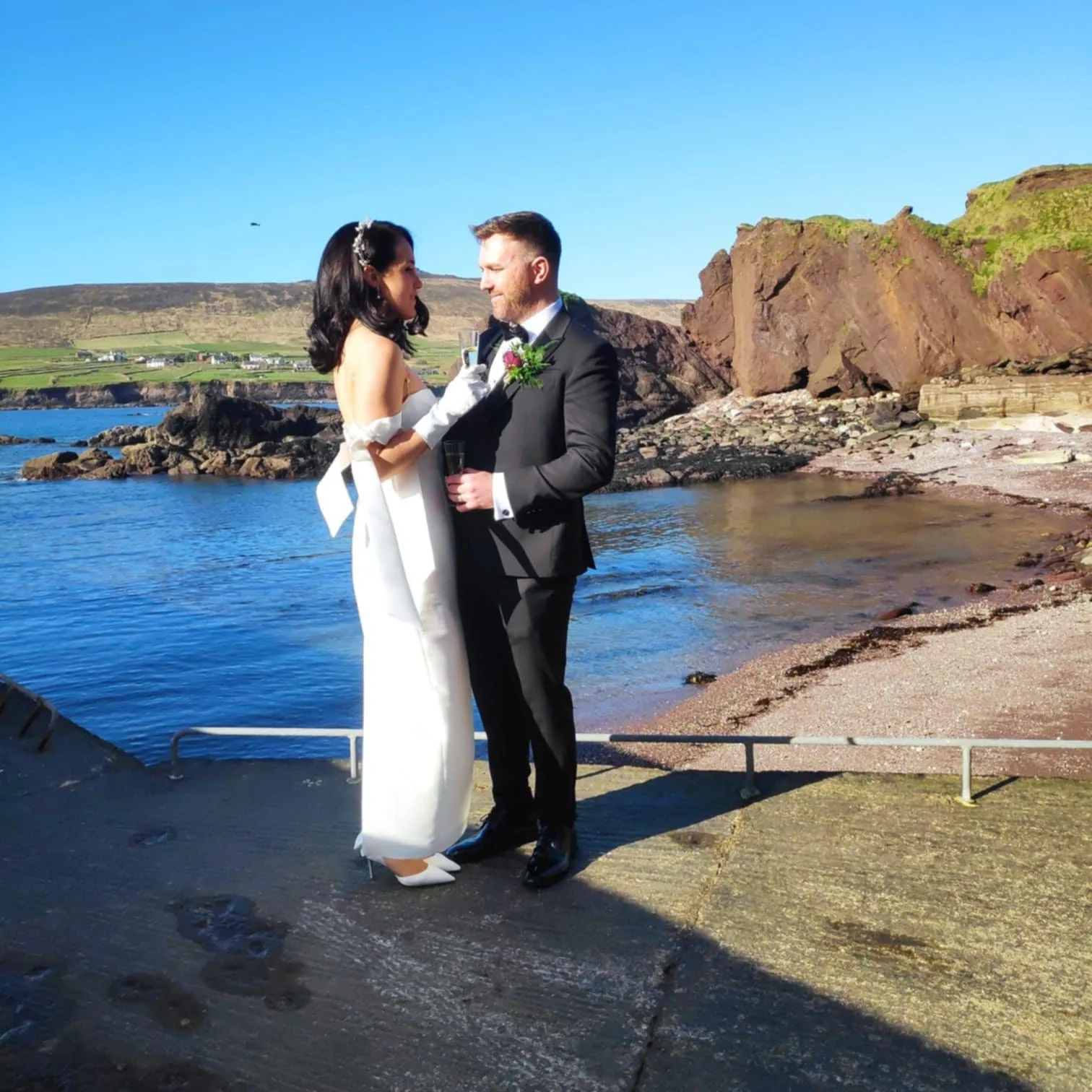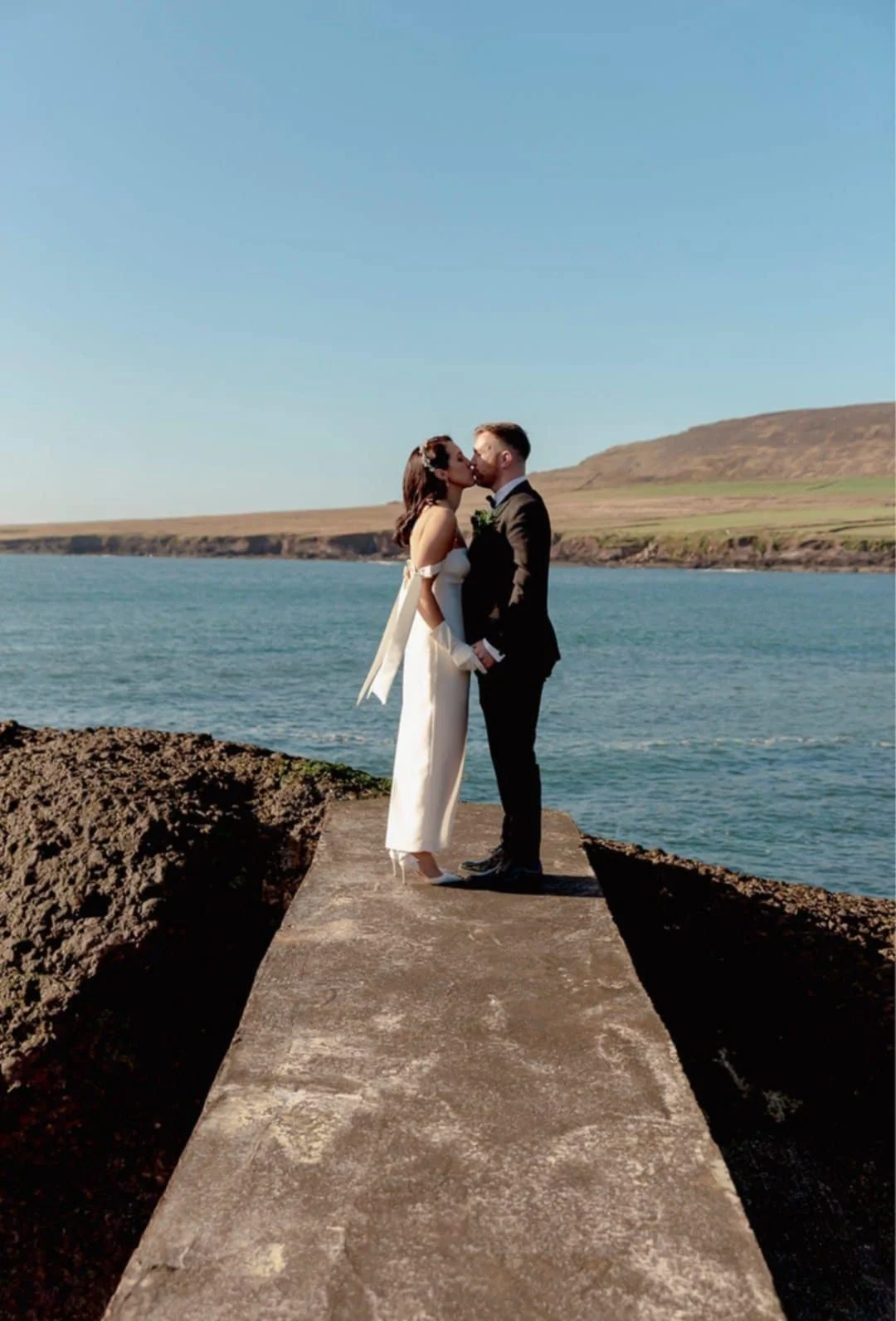 A bride and groom standing outdoors on a sunny day. Brides hair styled by Dingle-based hairstylist Maire Johnson