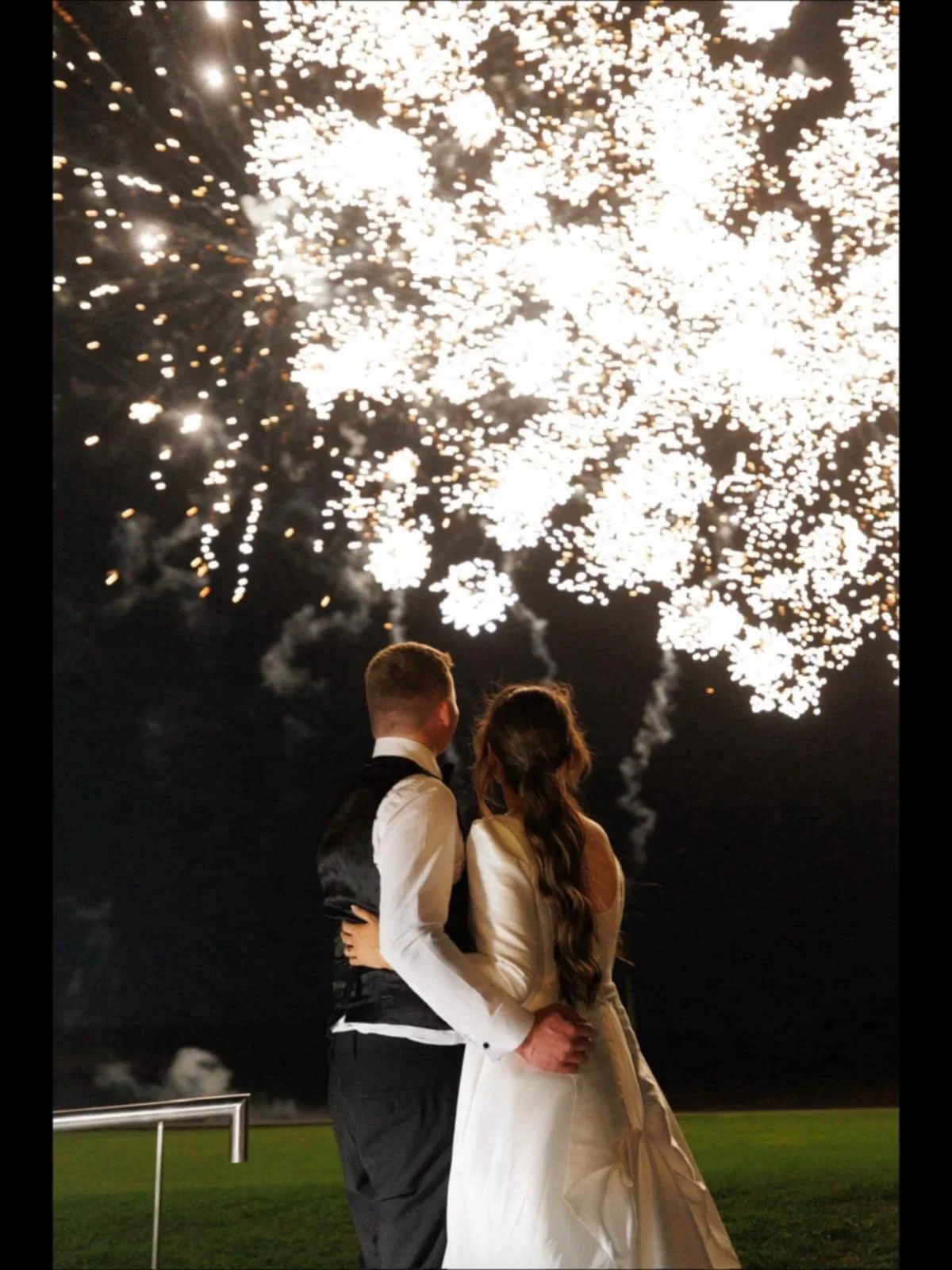 A couple dressed in wedding attire watching fireworks at night. Hair re-styled by Maire Johnson, Kerry-based wedding hair stylist.