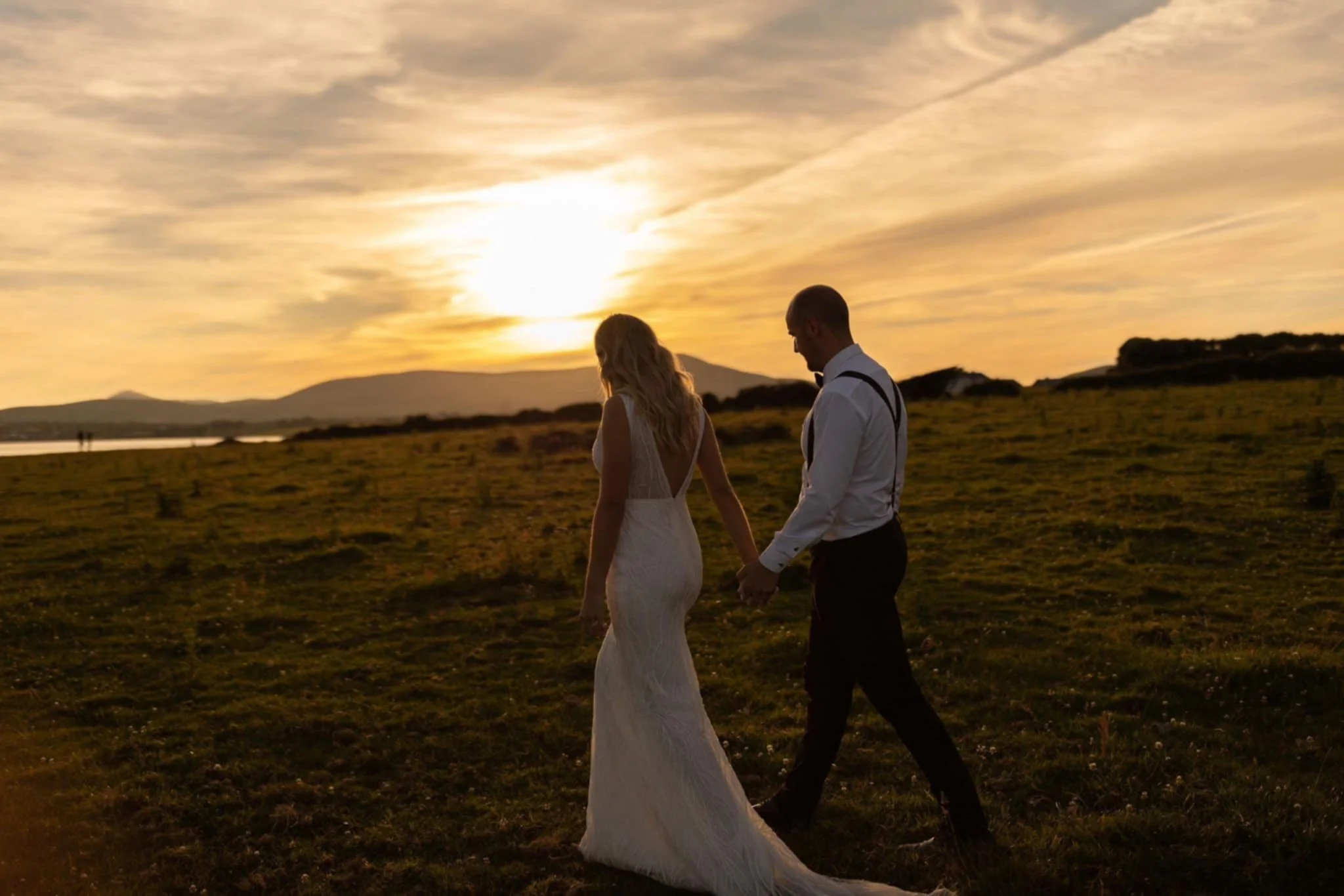 A couple dressed in wedding attire watching fireworks at night. Hair re-styled by Maire Johnson, Kerry-based wedding hair stylist. View fullsize