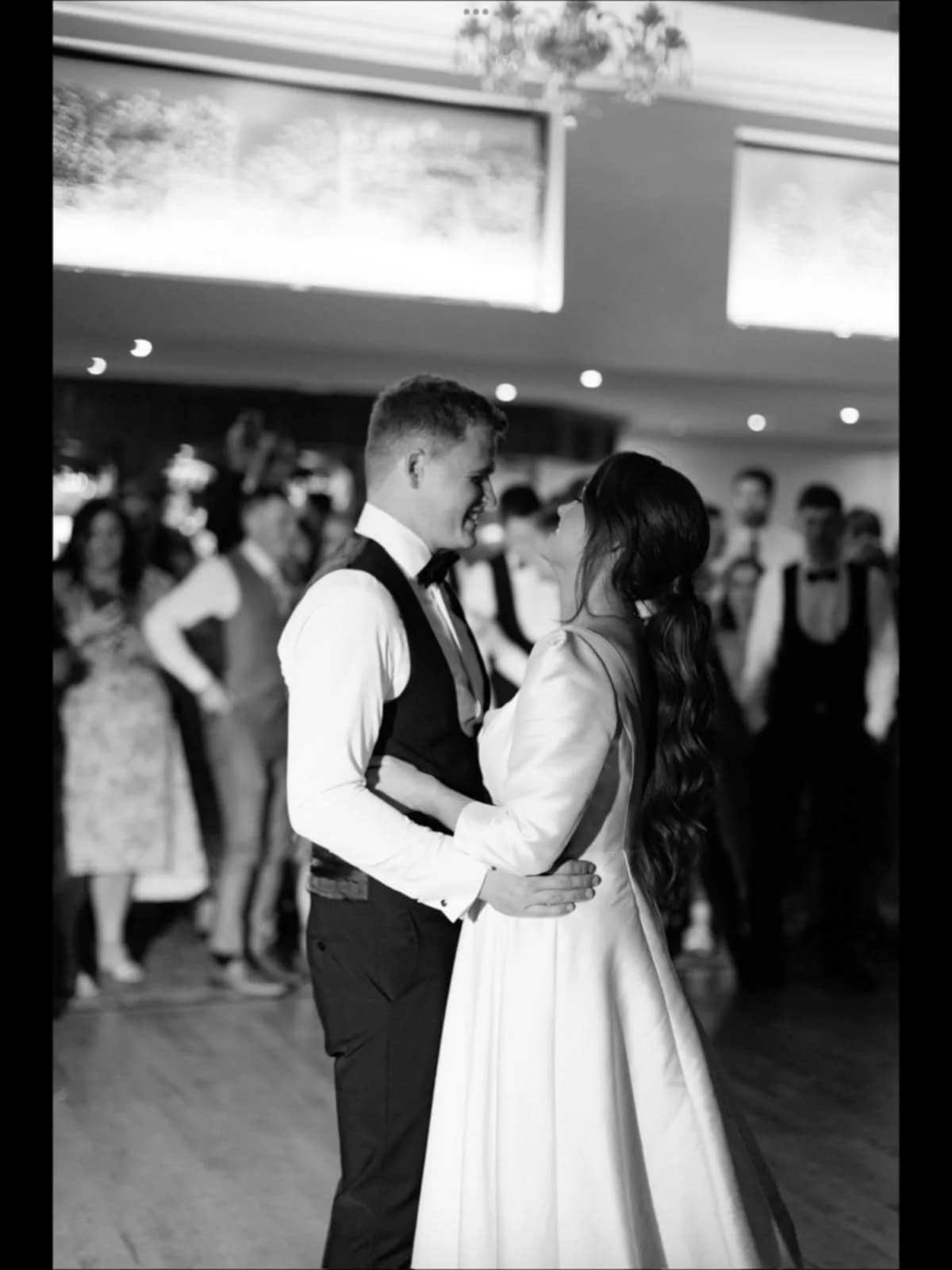 A couple, a man in a tuxedo and a woman in a wedding dress, dancing closely and smiling at each other. Half up, half down hair style by Maire Johnson, Kerry based hairstylist. View fullsize