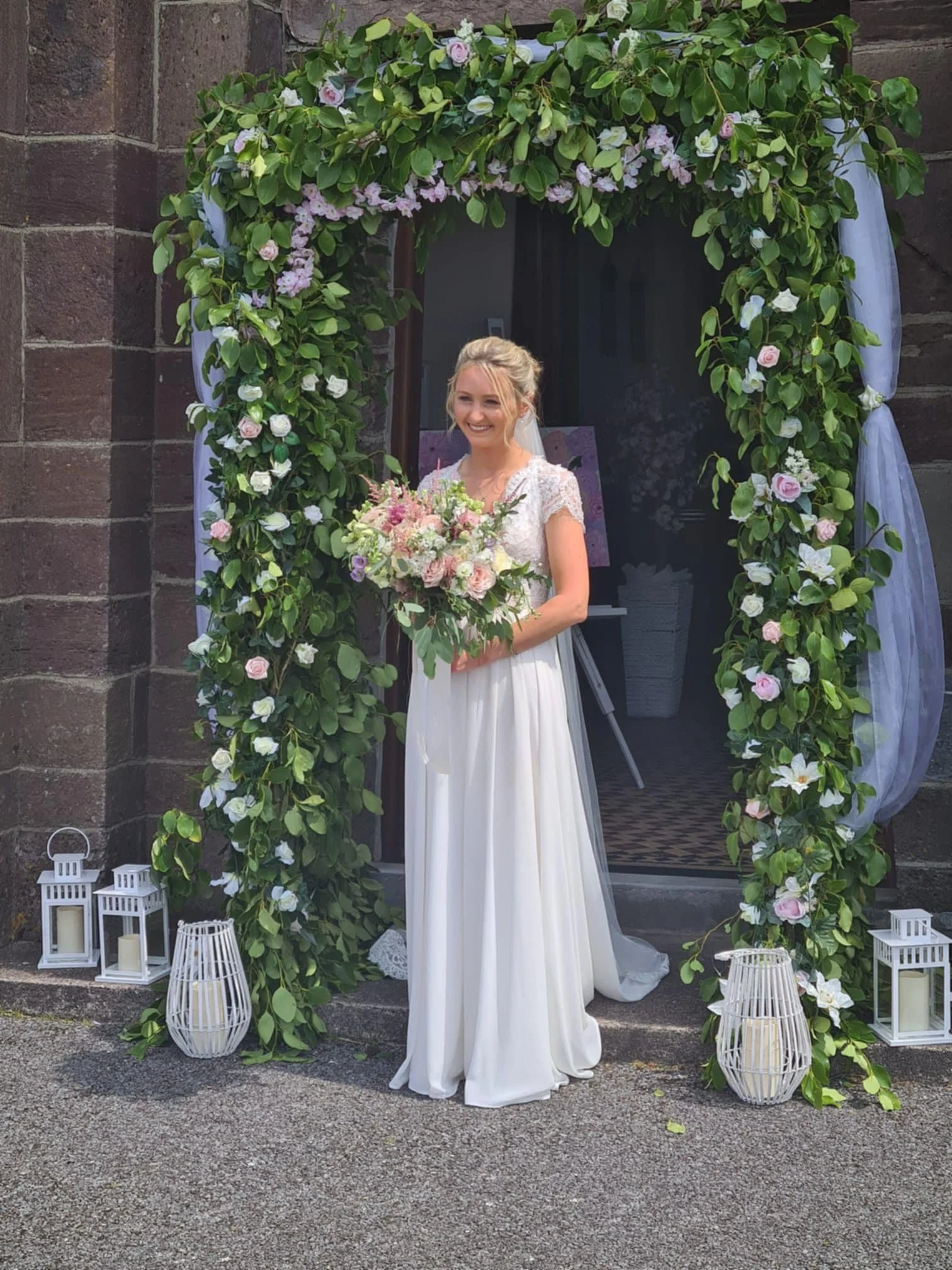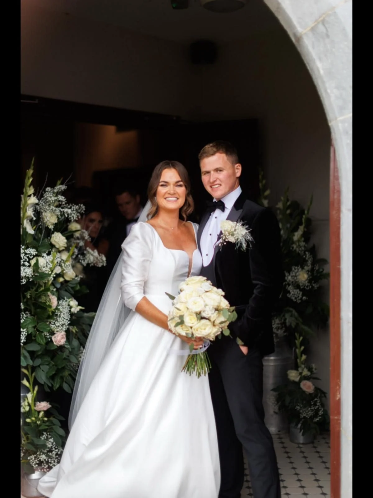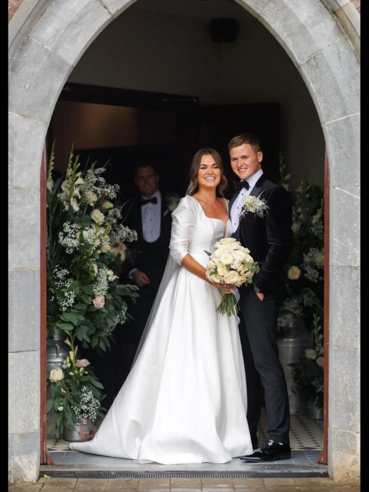 Bride and groom smiling at an indoor wedding ceremony, the bride holding a bouquet of white roses, surrounded by floral arrangements and a wedding officiant in the background. Hair styled by Maire Johnson, based in Kerry, Ireland.