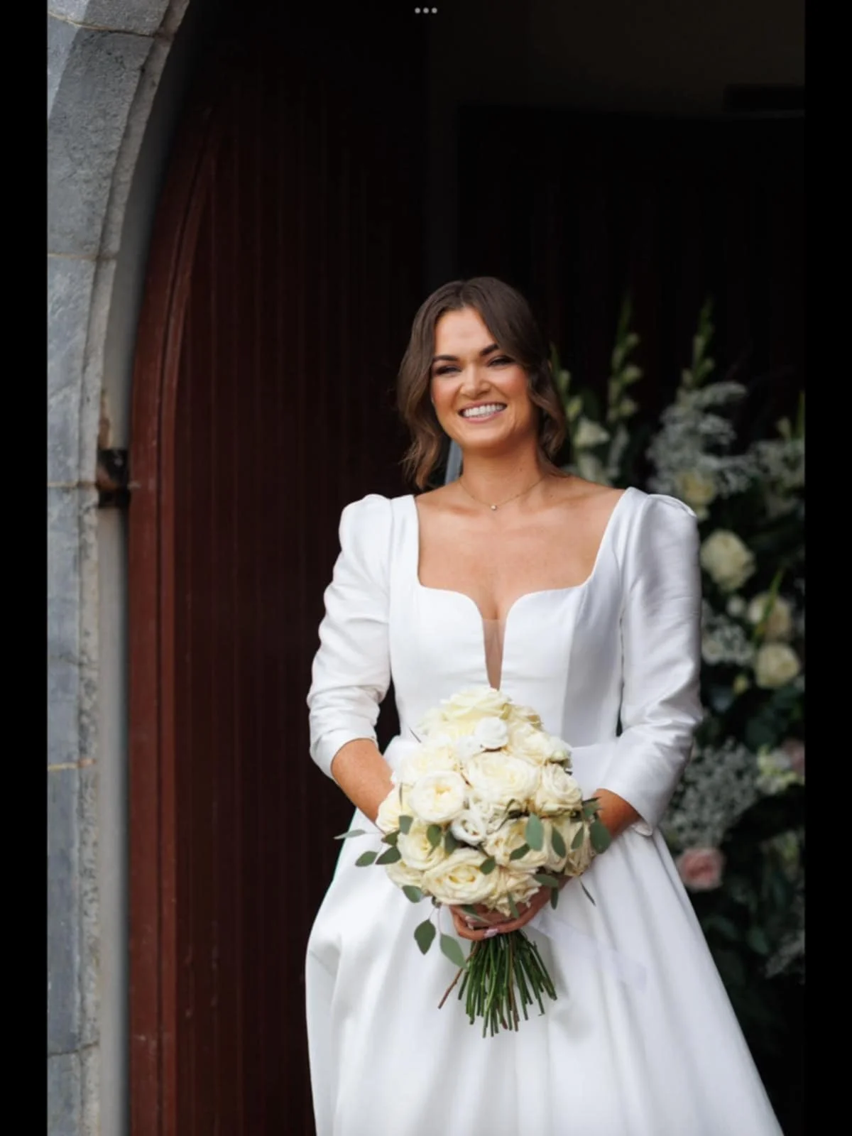 Bride and groom smiling at an indoor wedding ceremony, the bride holding a bouquet of white roses, surrounded by floral arrangements and a wedding officiant in the background. Hair styled by Maire Johnson, based in Kerry, Ireland. View fullsize